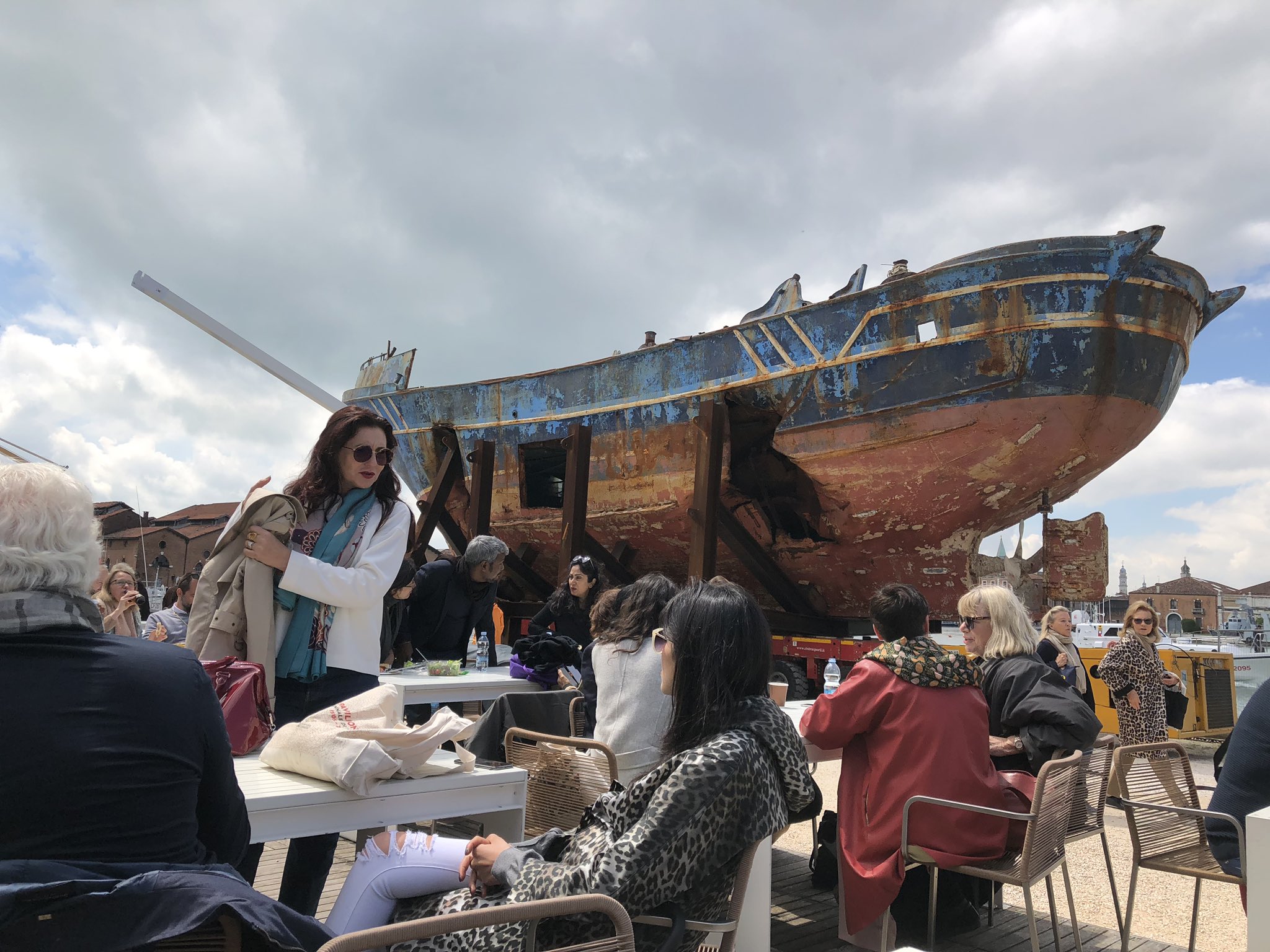 The choice to exhibit this boat at the Biennale has not escaped criticism. Italian journalist Lorenzo Tondo has expressed his discomfort over the exploitation of tragedy for the sake of provocation. He is not alone: The Art Newspaper describes the boat as the Biennale’s ‘most troubling display’ due to the lack of context or information about the boat’s history being provided to visitors. The artist, Christoph Büchel, has decided not only to provide no explanatory signs, but has also so far refused to comment on the exhibit. His collaborator Mariachiara di Trapani declared that she expects visitors to ‘feel respect for it and look at it in silence’, but the boat’s location next to the outdoor café makes this doubtful.